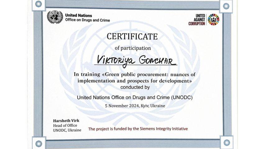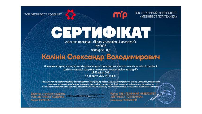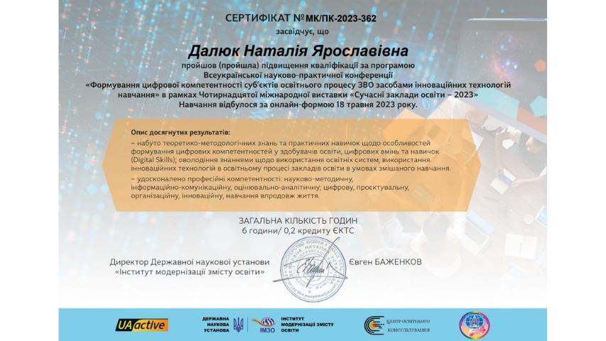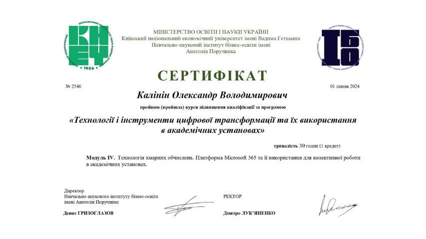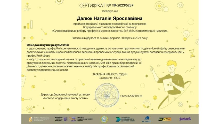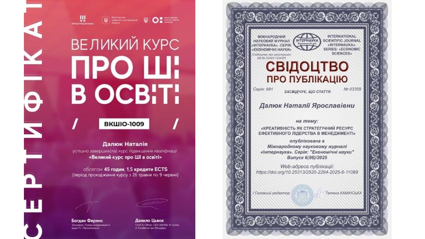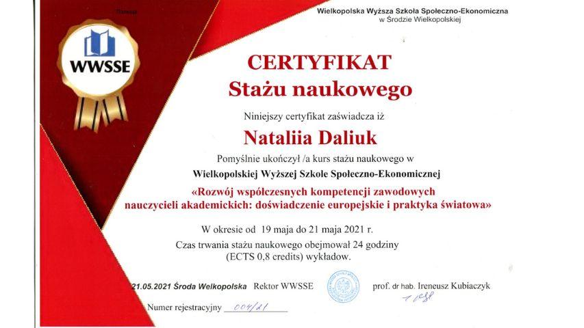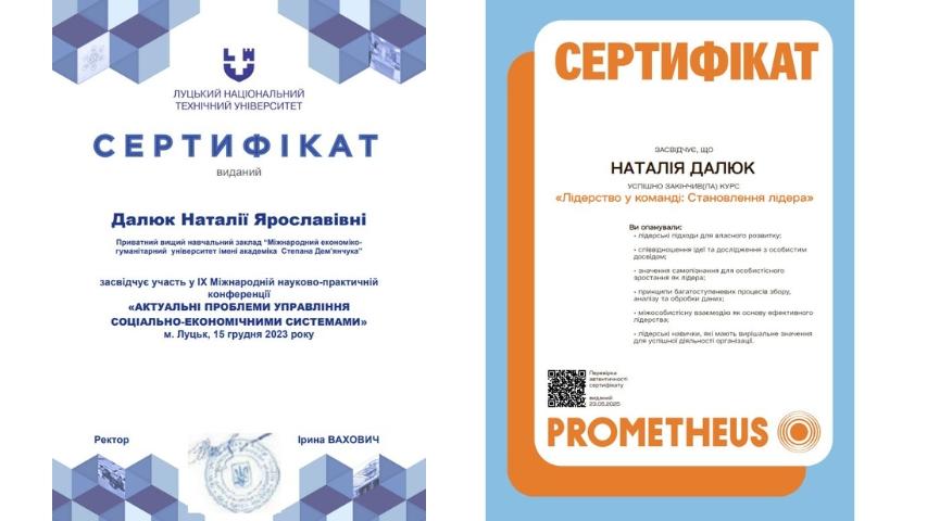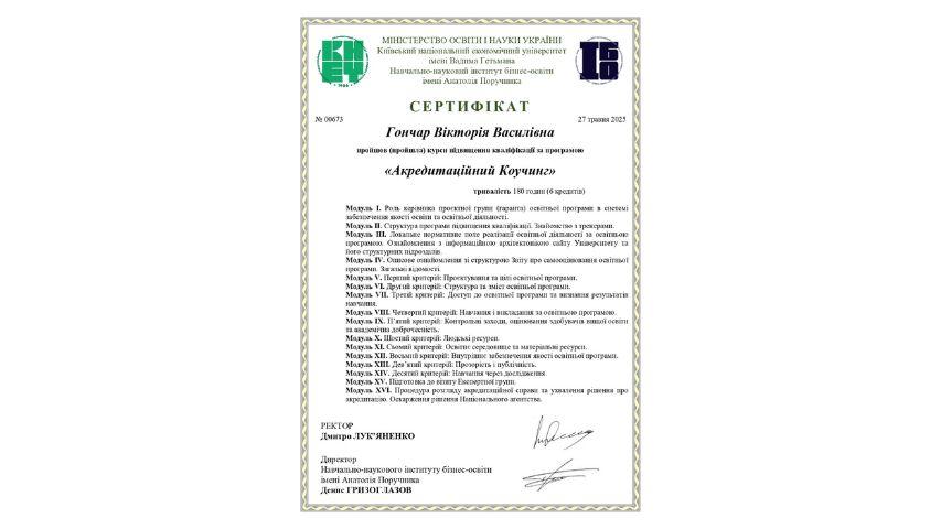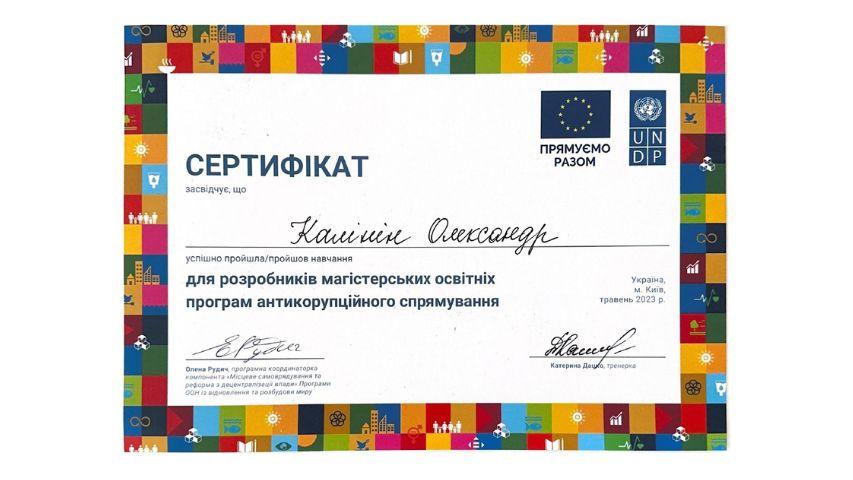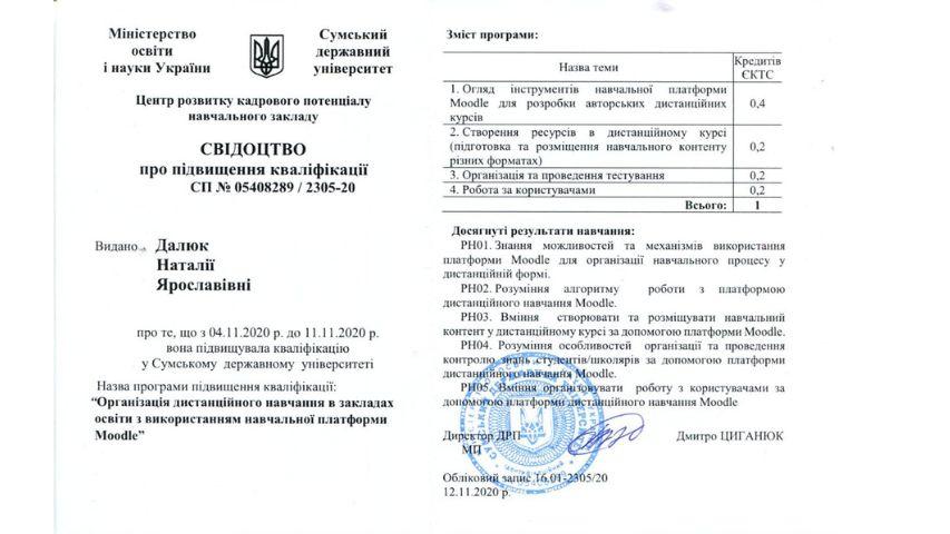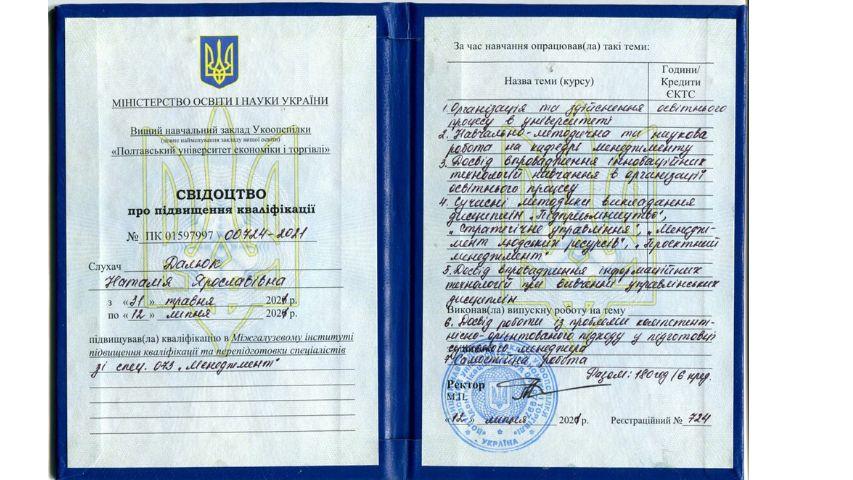 2015 рік – Вищий навчальний заклад «Національна академія управління» Свідоцтво про підвищення кваліфікації 12 СПК 902292 «Розвиток потенціалу у стратегічному управлінні» 23 грудня 2015 р. № СПК-15/147