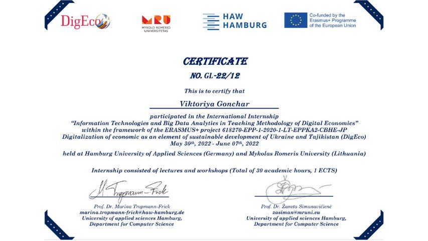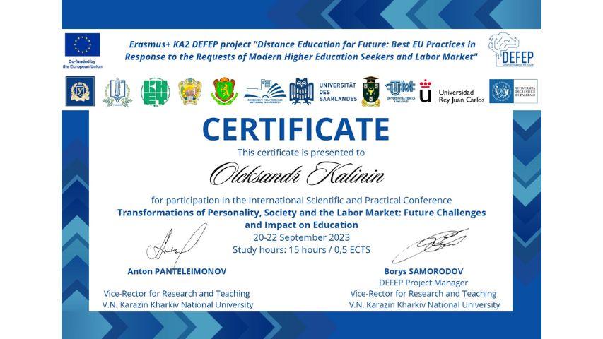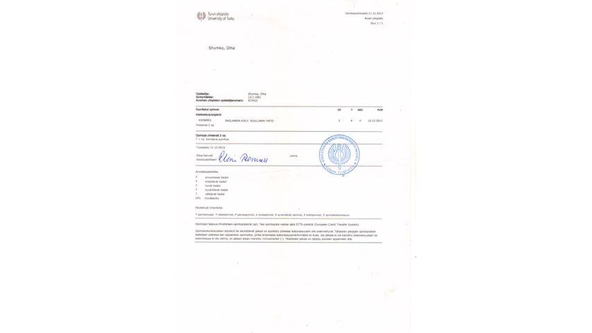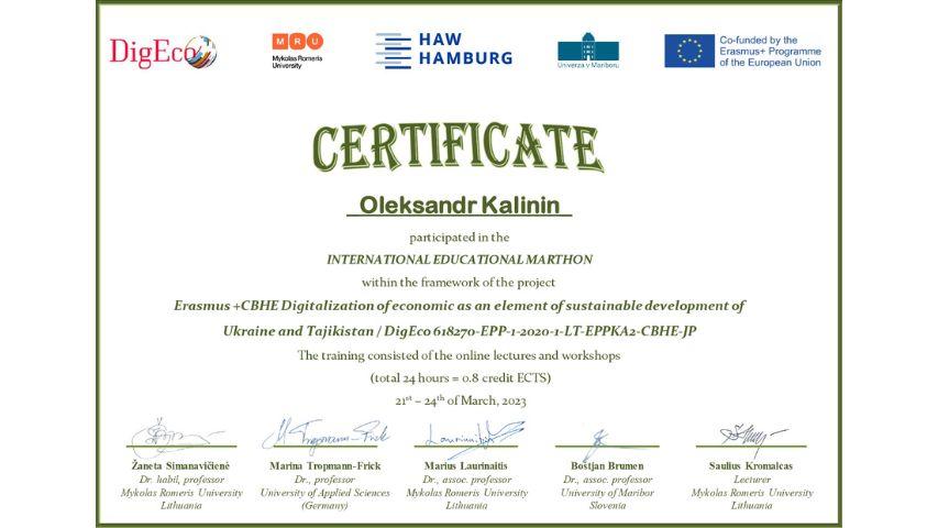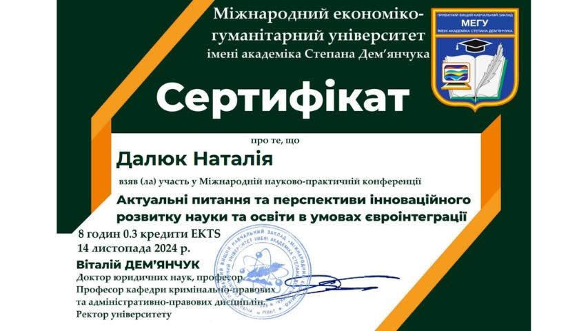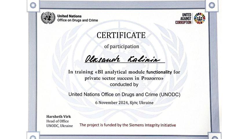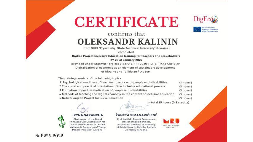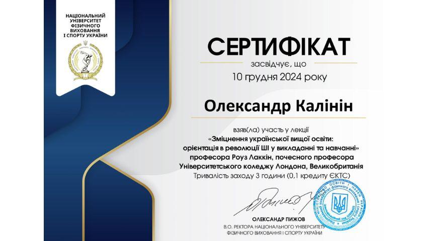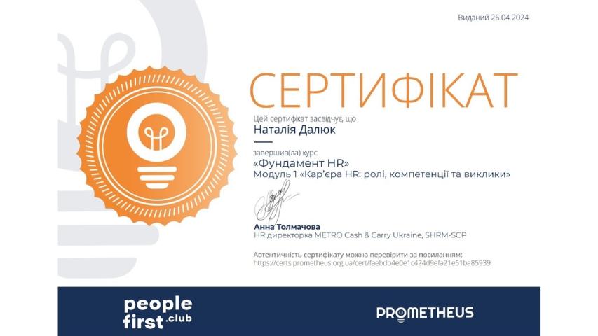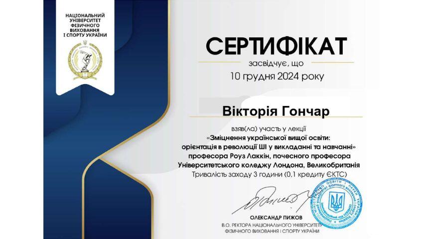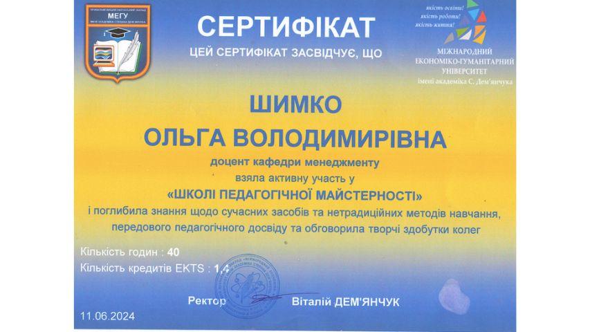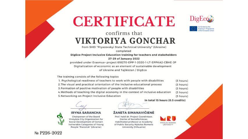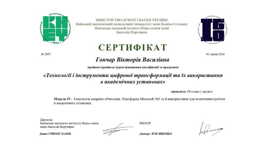2015 рік – Вищий навчальний заклад «Національна академія управління» Свідоцтво про підвищення кваліфікації 12 СПК 902292 «Розвиток потенціалу у стратегічному управлінні» 23 грудня 2015 р. № СПК-15/147