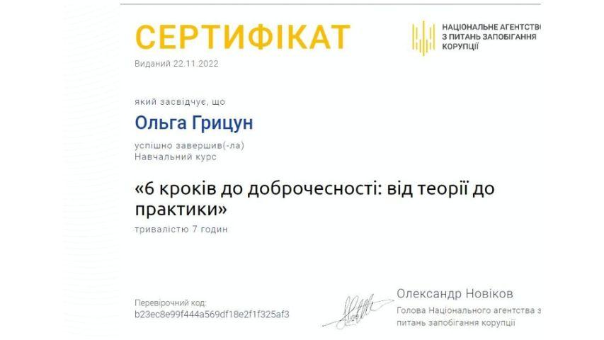 Освітній курс “Школа фінансової грамотності “Талан””, що реалізується Національним банком України у співпраці з Міністерством освіти і науки України, 2-25.08.2022р., (сертифікат №0024, 1 кредит ЄКТС – 30 годин).