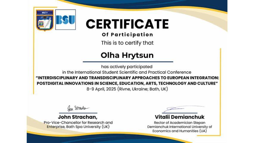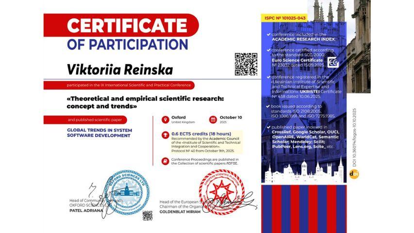 Міжнародне стажування INTERNATIONAL INTERNSHIP “EDUCATIONAL EXCHANGE AND PROFESSIONAL DEVELOPMENT IN ESTONIA”, conducted within the entrepreneurship education program “COMPANY PROGRAM”, 29 листопада 2025 року – 08 грудня 2025 року, JA Eesti (Member of JA Worldwide), JA Ukraine (Member of JA Worldwide) (сертифікат №20253623, 72 год. або 1,2 кредита ЄКТС).
