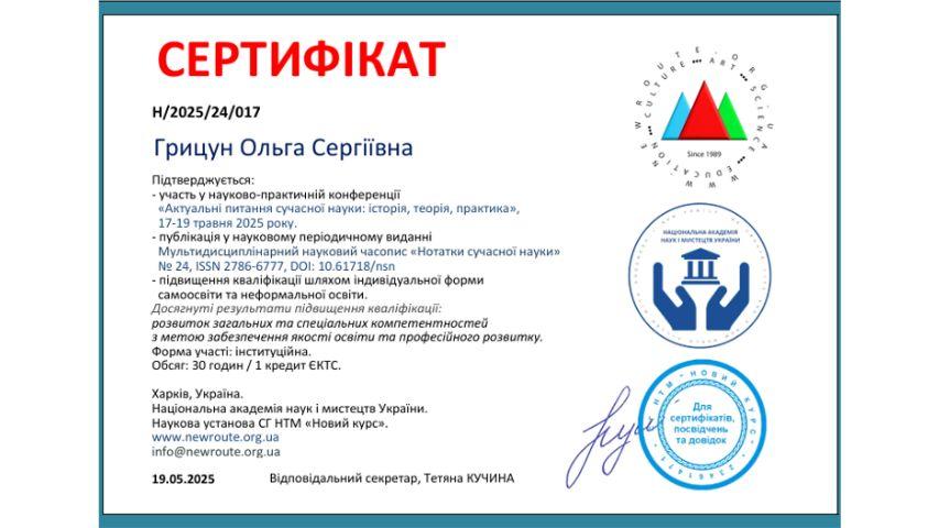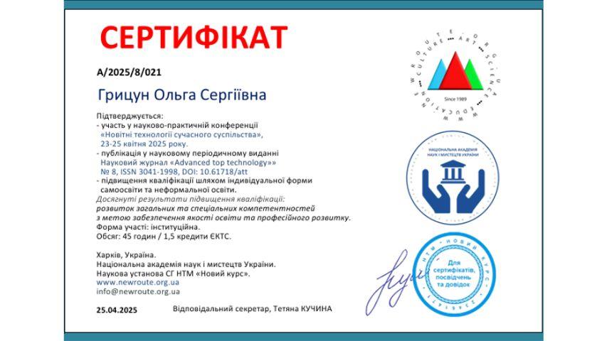 7. Грицун О.С. Адміністративно-правові аспекти цифровізації публічного управління в Україні. Науково-практична конференція «Новітні технології сучасного суспільства», 23-25 квітня 2025 року, публікація у науковому періодичному виданні Науковий журнал «Advanced top technology»» № 8, Національна академія наук і мистецтв України. Наукова установа СГ НТМ «Новий курс», м. Харків, Україна.