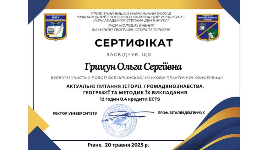 Всеукраїнський педагогічний марафон для педагогічних працівників системи МАН, обласних малих академій наук, закладів освіти України – 2025 (сертифікат №013082 від 14.05.2025, 10 год. або 0,3 кредита ЄКТС).