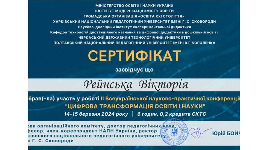Освітній онлайн-форум “Розвиток soft skills в сучасній школі: інструменти, методики, досвіди”, організатор Національний центр “Мала академія наук України”, 28-30 березня 2024 р. (сертифікат, 12 год. або 0,4 кредиту ЄКТС).