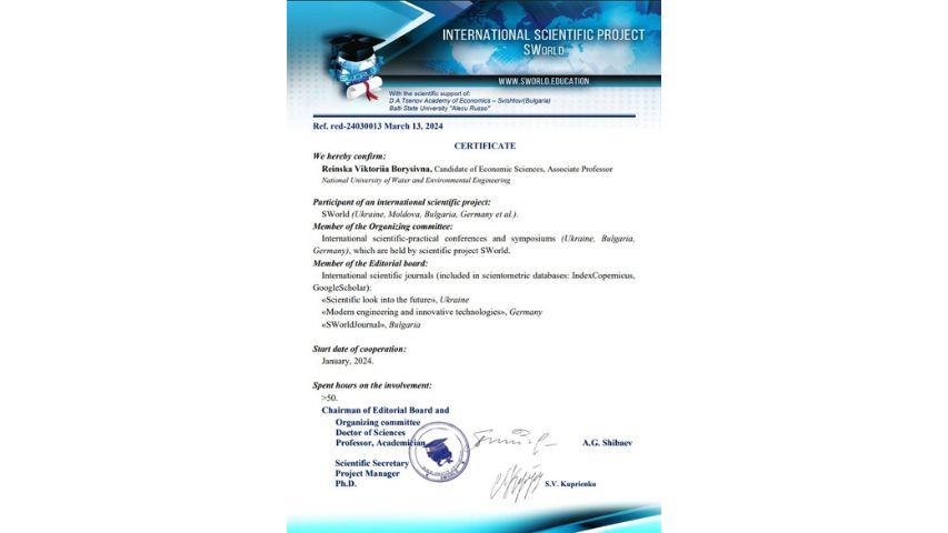 • Членство в Рівненському обласному об’єднанні громадської організації «Спілка економістів України» (довідка № 39 від 10.09.2020 р).