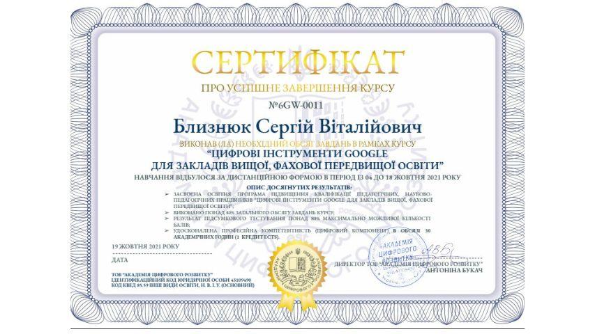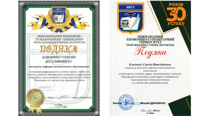 2010 рік Грамота Рівненської МАН за підготовку переможців 2 та 3 етапів Всеукраїнського конкурсу-захисту науково-дослідницьких робіт у секції «Прикладна математика».