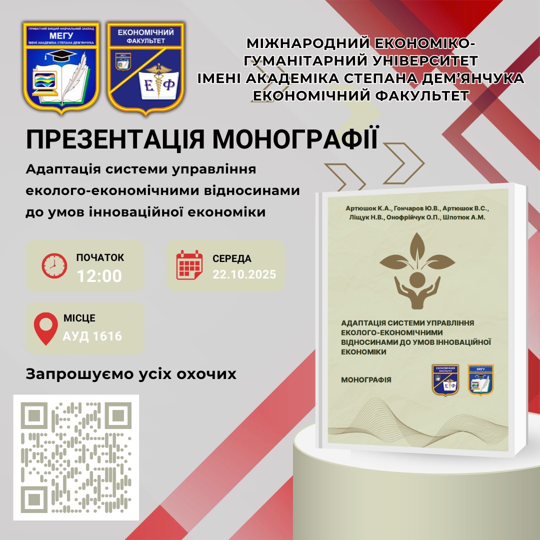 У середу 22 жовтня 2025 року відбулася публічна презентація колективної монографії економічного факультету «Адаптація системи управління еколого-економічними відносинами до умов інноваційної економіки». Видання затверджене до друку Вченою радою Приватного вищого навчального закладу «Міжнародний економіко-гуманітарний університет імені академіка Степана Дем’янчука».
